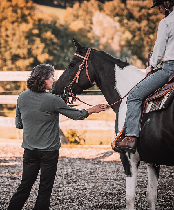 Mit meiner 30 jährigen Erfahrung als Reitlehrerin und Trainerin habe ich ein Gespür für die jeweilige Situation entwickelt und merke sehr schnell welches Thema zu der aktuellen Trainingseinheit passt.